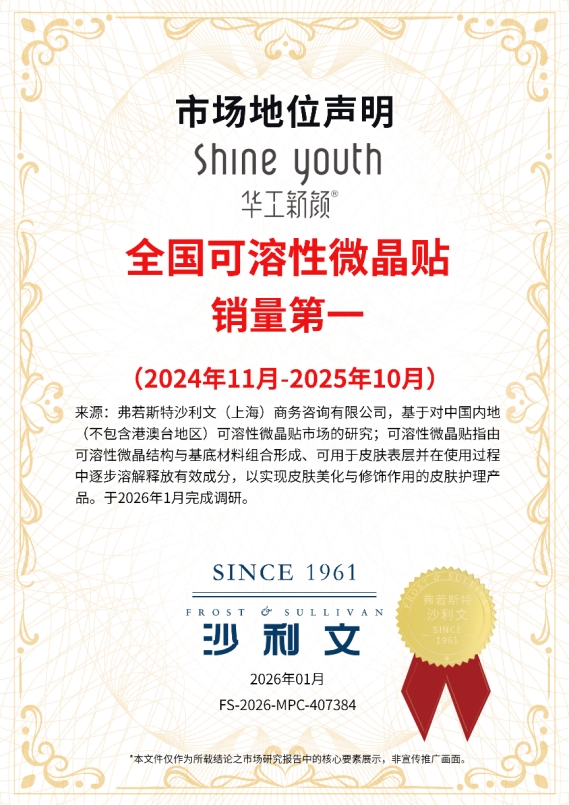 近日,弗若斯特沙利文(Frost & Sullivan)发布的权威市场报告显示,在快速崛起的可溶性微晶(又称可溶性微针)赛道中,华工新颜凭借全链路布局、核心技术突破及强劲的市场表现,2024年到2025年销量第一,稳居市场占有率首位,成为国内可溶性微针行业的领军品牌。